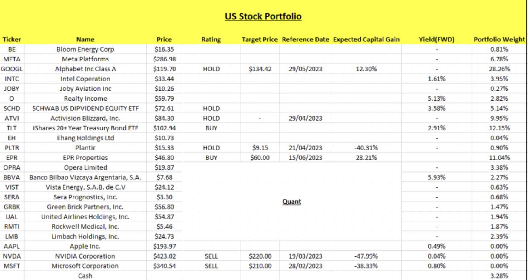 This is my main portfolio, U.S stock portfolio. It has shown a positive performance of approximately 23% during the first half of the year, which I consider to be decent compared to the market. The rise of Meta and Palantir, linked to the AI theme, has been favorable. However, I believe Palantir may have slightly overshot its potential at this point, so I decided to sell half of my holdings. If Meta continues to rise, I plan to consider selling a portion as well.
